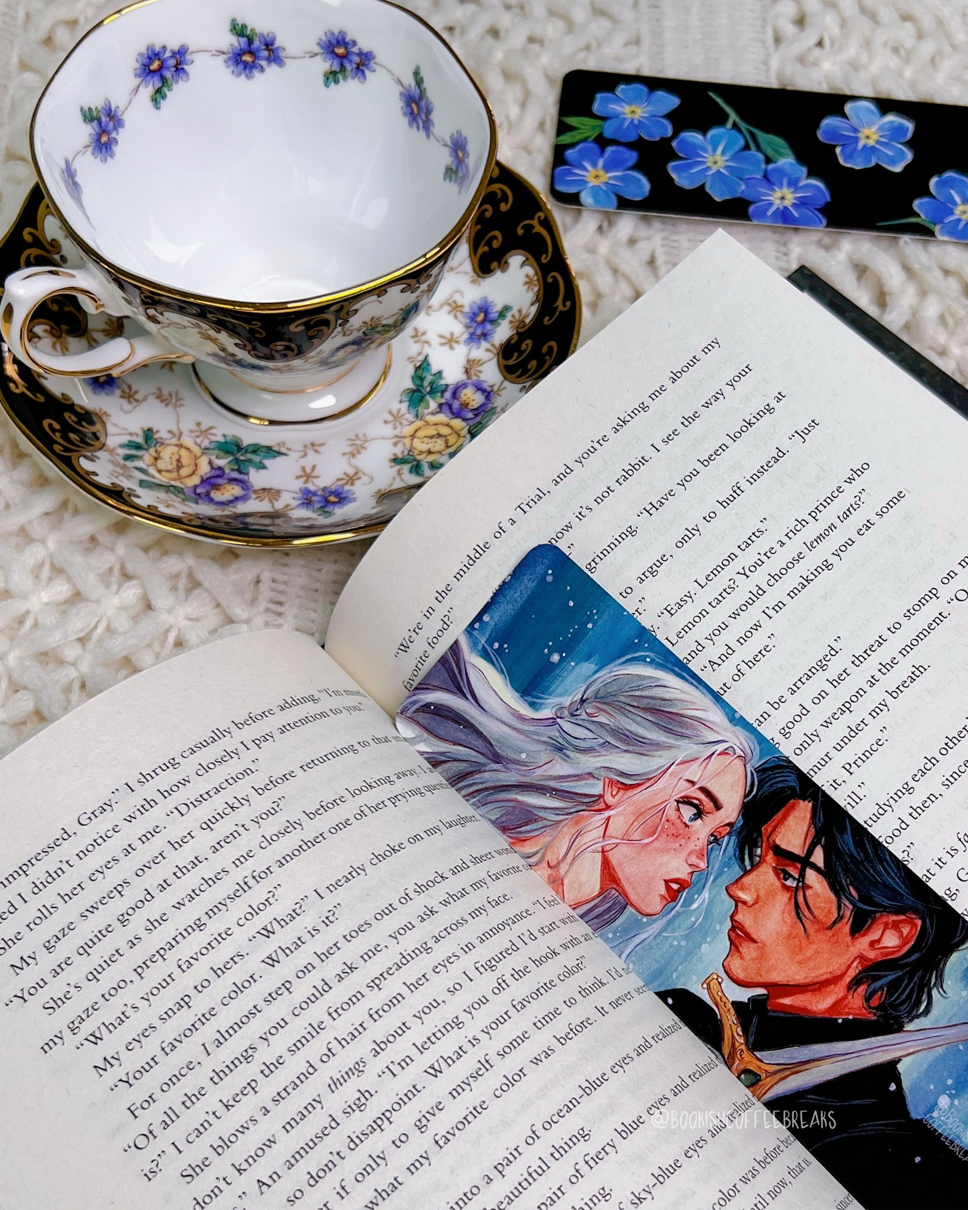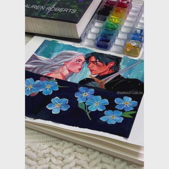 This enemies-to-lovers bookmark captures a fan-favorite moment of tension, inspired by the beloved romantasy book Powerless. The reverse side features delicate forget-me-nots, symbolizing memory, love, and resilience. A perfect keepsake for any fantasy lover's collection🖤