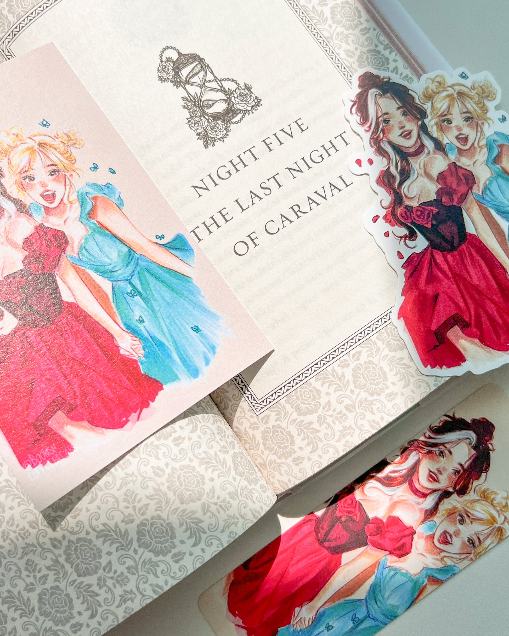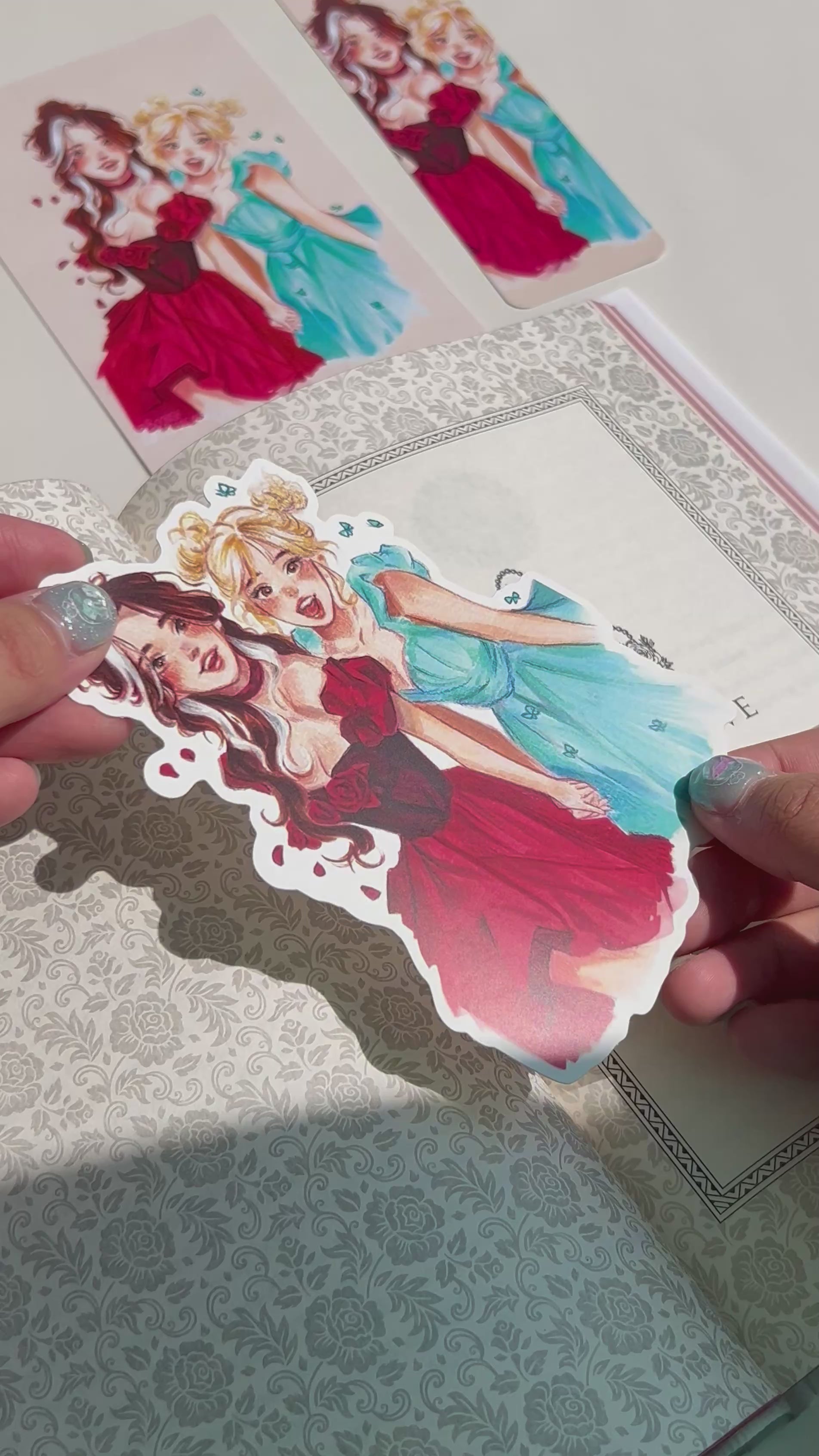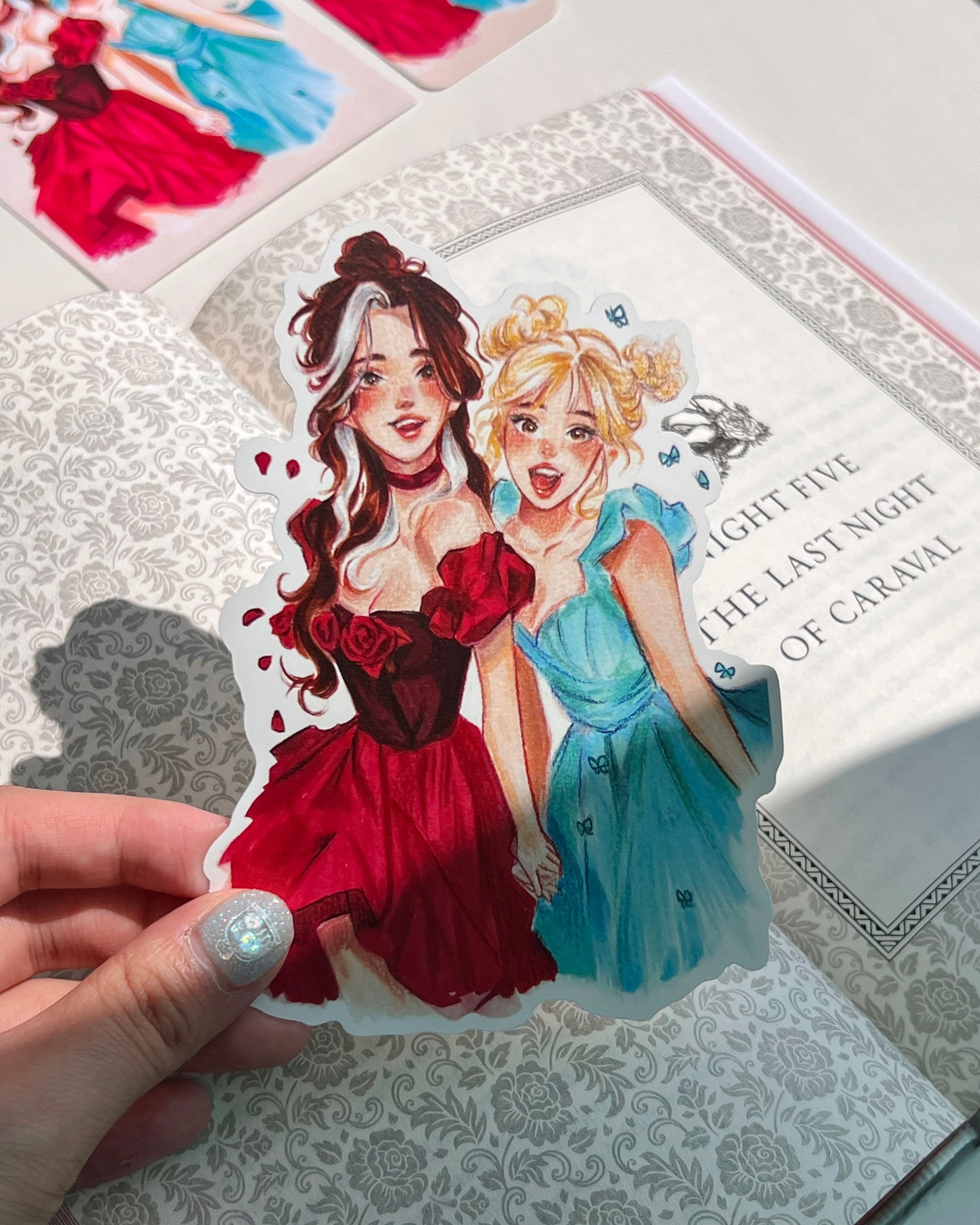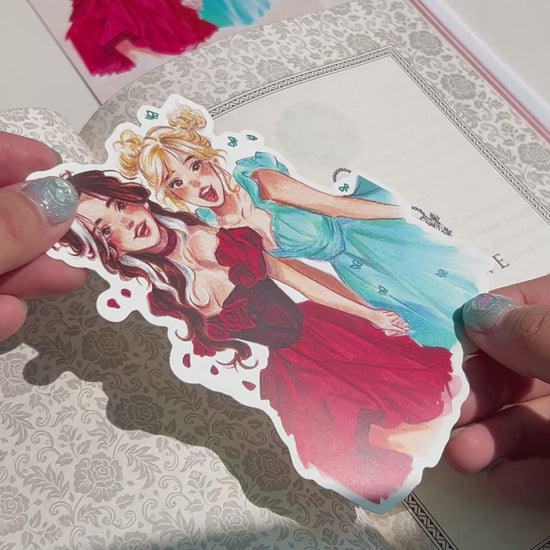 This vibrant matte sticker features a reimagined duo from a beloved fantasy series, dressed in playful Gen Z-inspired gowns. With petals, butterflies, and the buzz of summer magic in the air, this joyful sisterly moment is full of sparkle and whimsy—perfect for decorating your journal, laptop, or book cart!