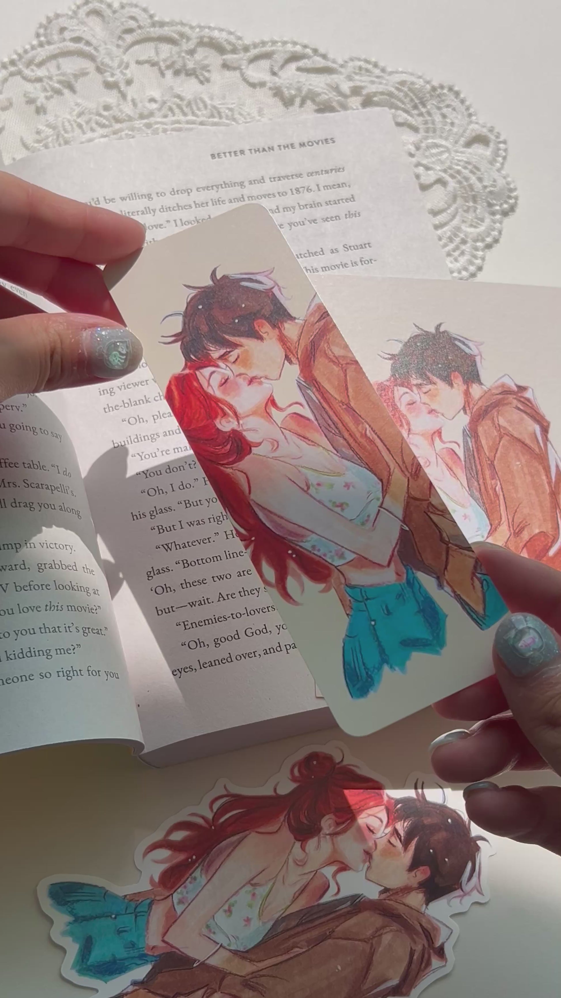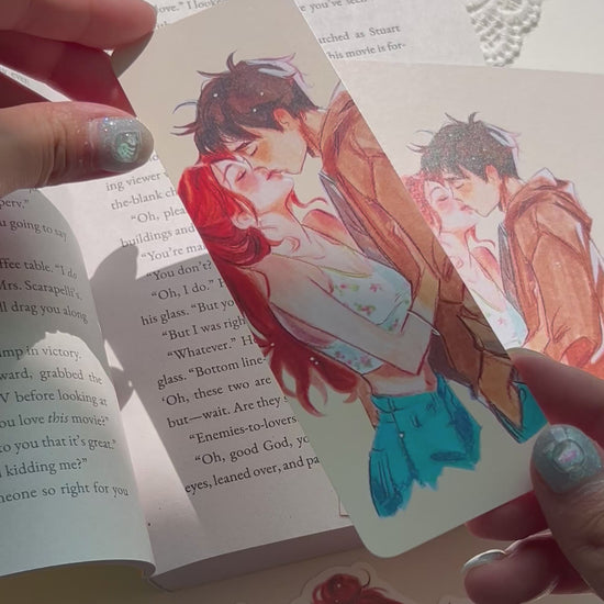 This playful bookmark features a snarky-sweet couple from a charming romcom novel. With one side zoomed in on the chemistry and the other showing their full moment together, it’s the perfect companion for lighthearted reads.