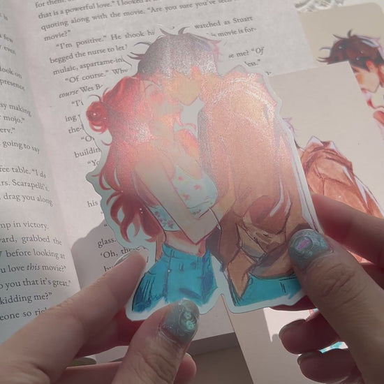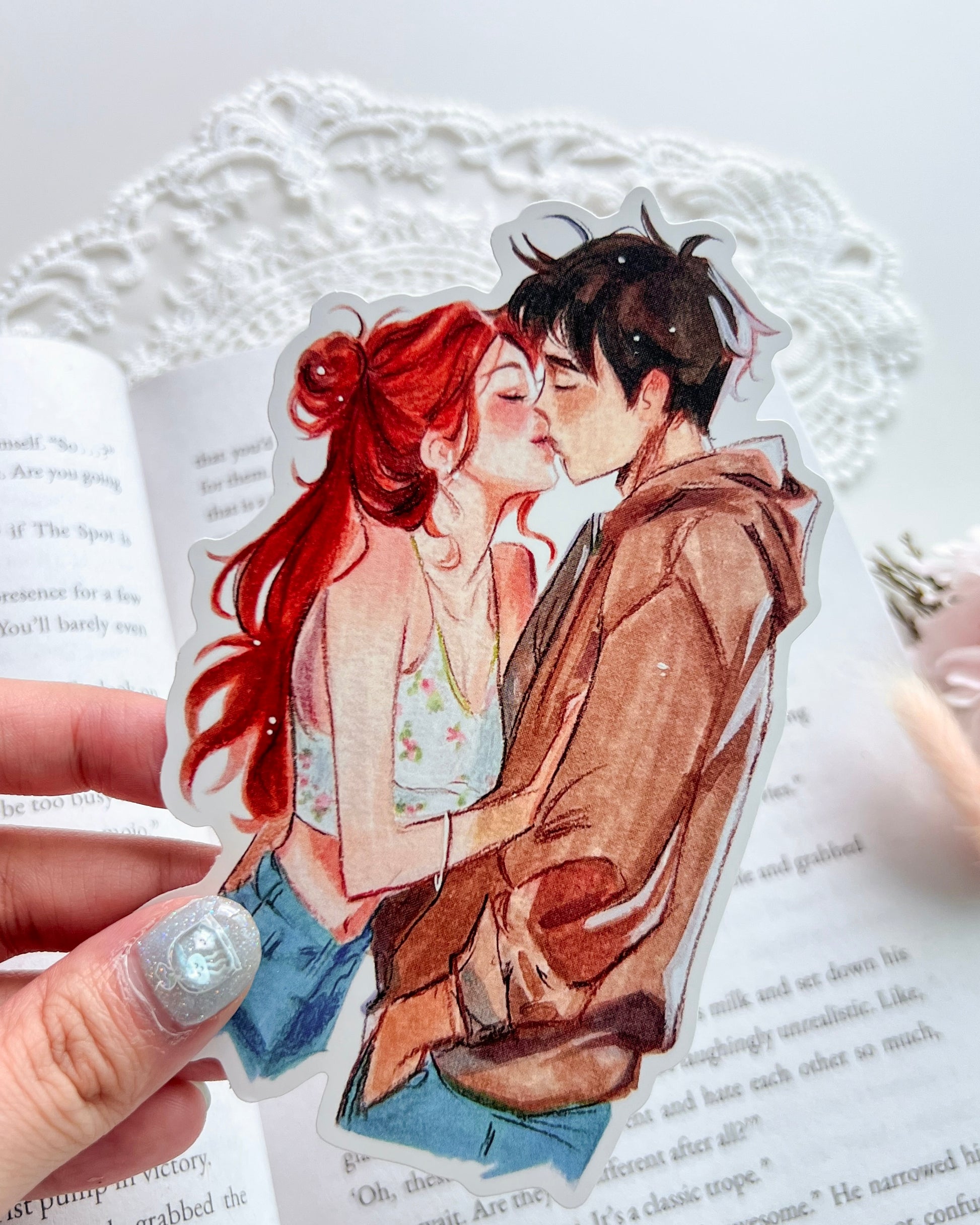 This romantic matte sticker captures the summer spark between a redheaded bookworm and her annoying (yet irresistible) neighbor, inspired by a swoony romcom couple from a beloved YA novel. Perfect for those who love flirty tension and heartwarming kisses!